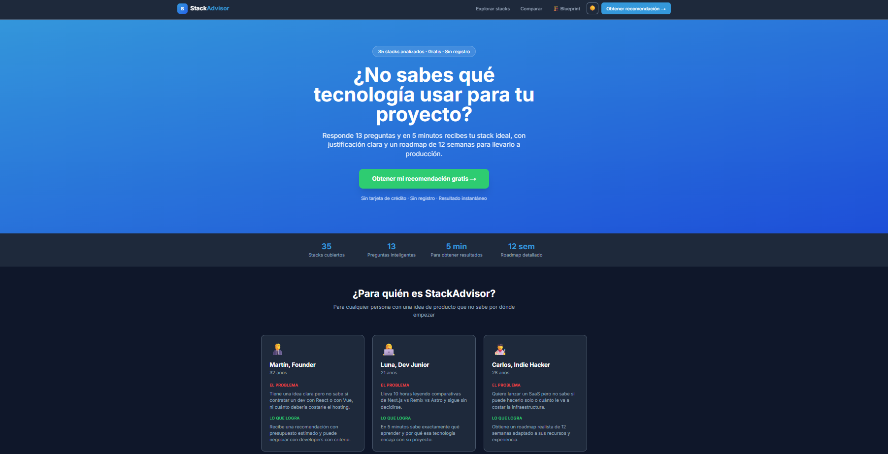 SaaS que resuelve la parálisis de decisión tecnológica: 13 preguntas inteligentes → stack ideal con justificación detallada + roadmap de 12 semanas personalizado. Motor de recomendación propio con 25+ stacks evaluados. Pensado para founders sin CTO y developers tomando decisiones arquitectónicas críticas.